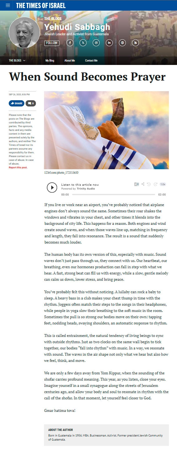 When Sound Becomes Prayer (Times of Israel - 26 Sep 2025)
