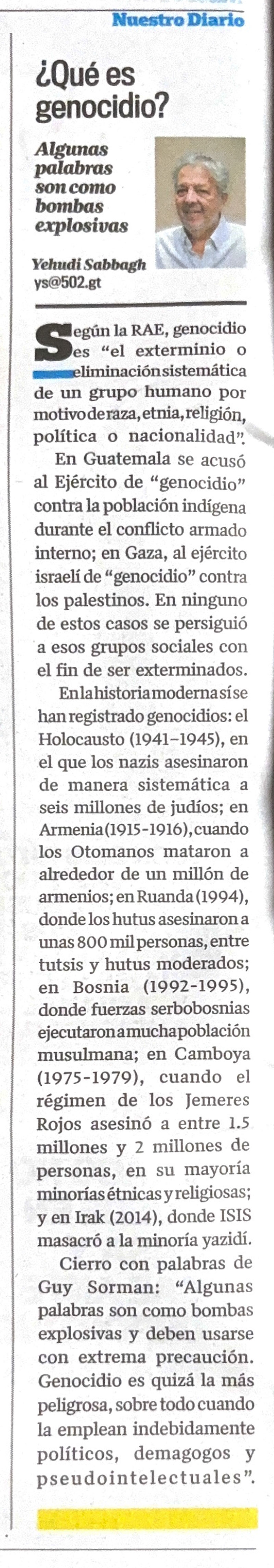 Cierro con palabras de Guy Sorman: “Algunas palabras son como bombas explosivas y deben usarse con extrema precaución. Genocidio es quizá la más peligrosa, sobre todo cuando la emplean indebidamente políticos demagogos y pseudointelectuales.”