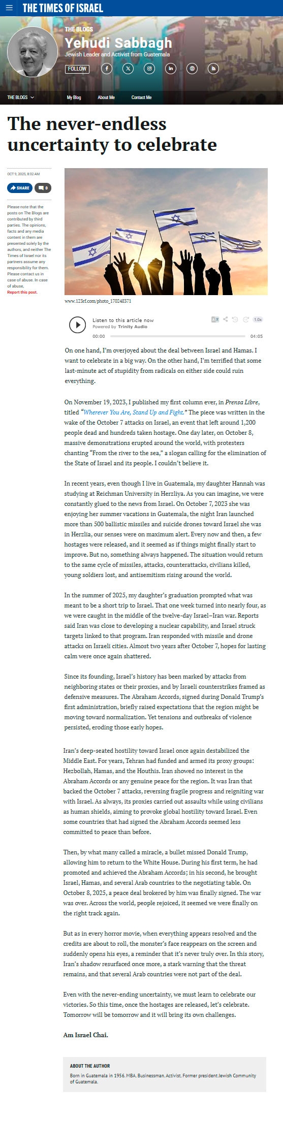In recent years, even though I live in Guatemala, my daughter Hannah was studying at Reichman University in Herzliya. As you can imagine, we were constantly glued to the news from Israel. On October 7, 2023 she was enjoying her summer vacations in Guatemala, the night Iran launched more than 500 ballistic missiles and suicide drones toward Israel she was in Herzlia, our senses were on maximum alert. Every now and then, a few hostages were released, and it seemed as if things might finally start to improve. But no, something always happened. The situation would return to the same cycle of missiles, attacks, counterattacks, civilians killed, young soldiers lost, and antisemitism rising around the world.