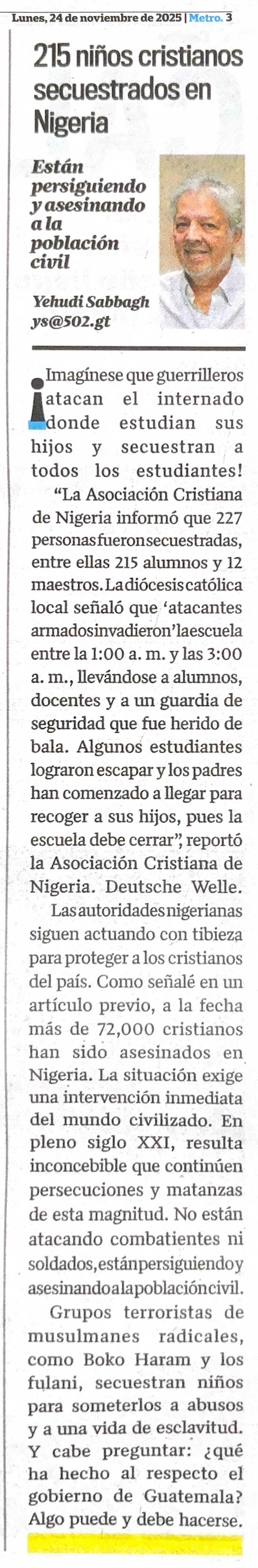 < Más Articulos : 215 ninos cristianos secuestrados en Nigeria (Nuestro Diario - 24 Nov 2025)