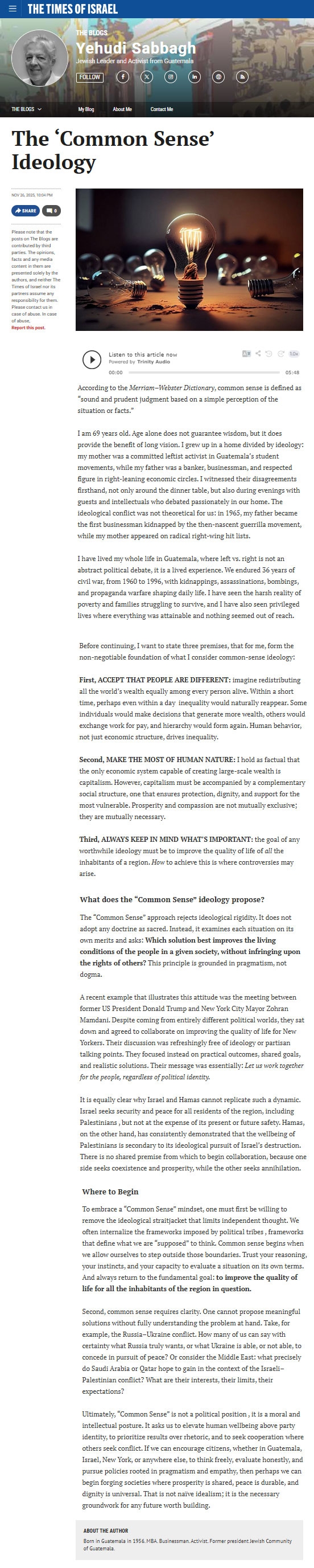 The Common Sense Ideology (Times of Israel - 26 Nov 2025)