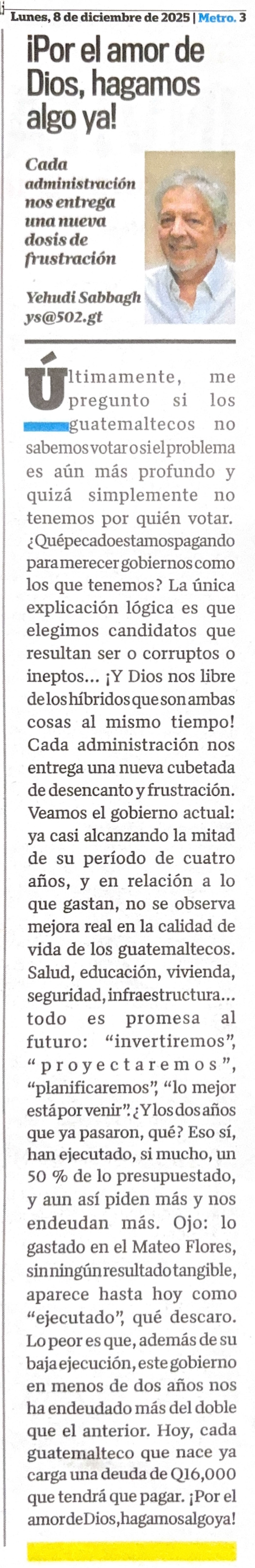 Lo peor es que, además de su baja ejecución, este gobierno en menos de dos años nos ha endeudado más del doble que el anterior. Hoy, cada guatemalteco que nace ya carga una deuda de Q16,000 que tendrá que pagar. ¡Por el amor de Dios, hagamos algo ya!