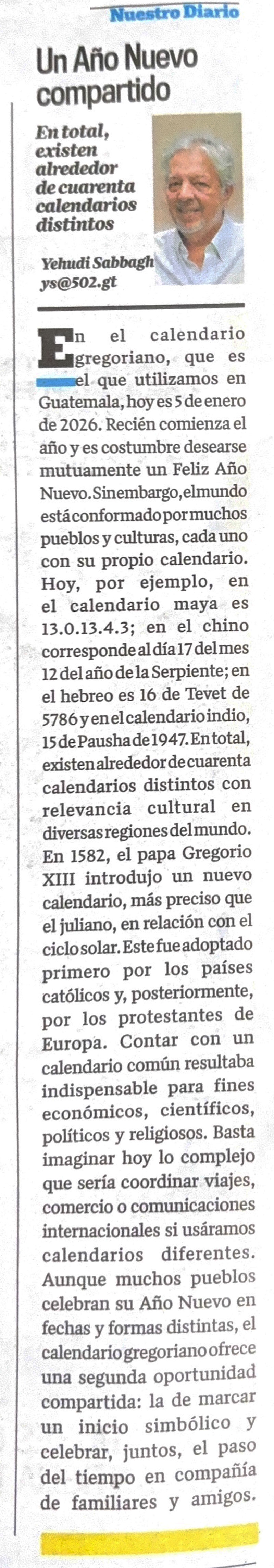 En el calendario gregoriano, que es el que utilizamos en Guatemala, hoy es 5 de enero de 2026. Recién comienza el año y es costumbre desearse mutuamente un Feliz Año Nuevo. Sin embargo, el mundo está conformado por muchos pueblos y culturas, cada uno con su propio calendario.