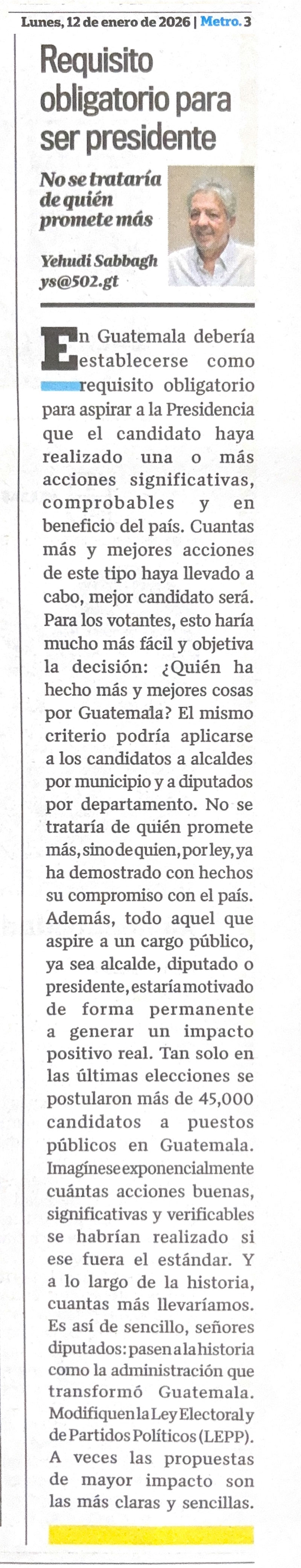 En Guatemala debería establecerse como requisito obligatorio para aspirar a la Presidencia que el candidato haya realizado una o más acciones significativas, comprobables y en beneficio del país. Cuantas más y mejores acciones de este tipo haya llevado a cabo, mejor candidato será.