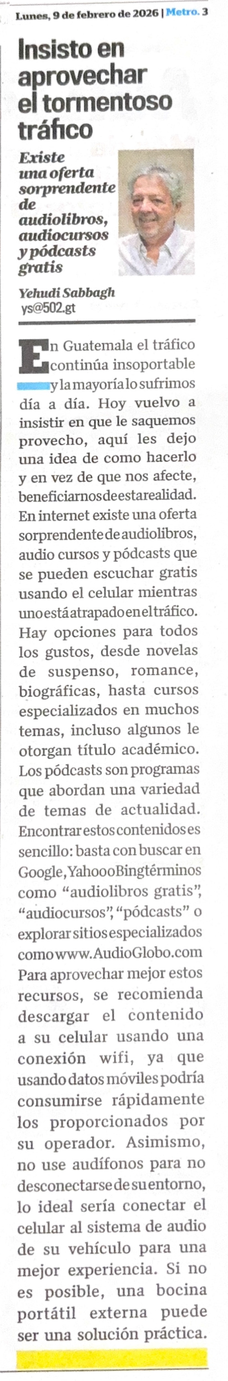 En internet existe una oferta sorprendente de audiolibros, audio cursos y podcasts que se pueden escuchar gratis usando el celular mientras uno está atrapado en el tráfico. Hay opciones para todos los gustos, desde novelas de suspenso, romance o biográficas, hasta cursos especializados en muchos temas, incluso algunos le otorgan título académico. Los podcasts son programas que abordan una variedad de temas de actualidad. Encontrar estos contenidos es sencillo: basta con buscar en Google, Yahoo o Bing términos como “audiolibros gratis”, “audio cursos”, “podcasts” o explorar sitios especializados como www.AudioGlobo.com
