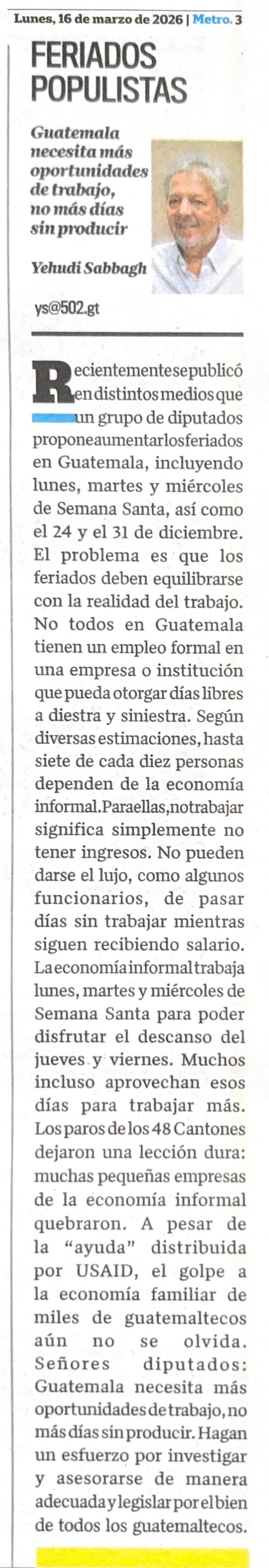 Señores diputados: Guatemala necesita más oportunidades de trabajo, no más días sin producir. Hagan un esfuerzo por investigar y asesorarse de manera adecuada y legislar por el bien de todos los guatemaltecos.