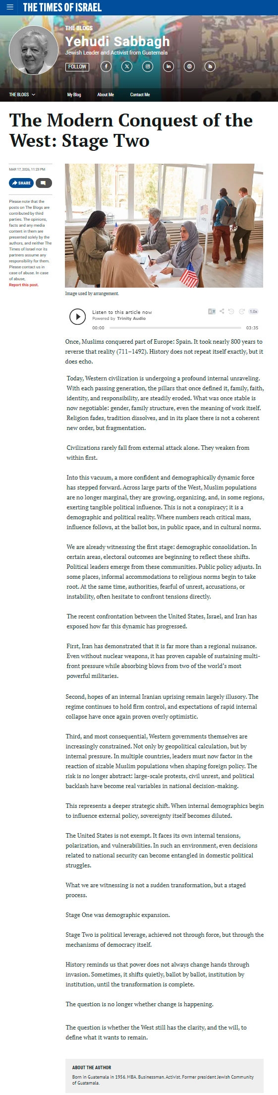 The Modern Conquest of the West: Stage Two (Times of Israel - 18 Mar 2026)
