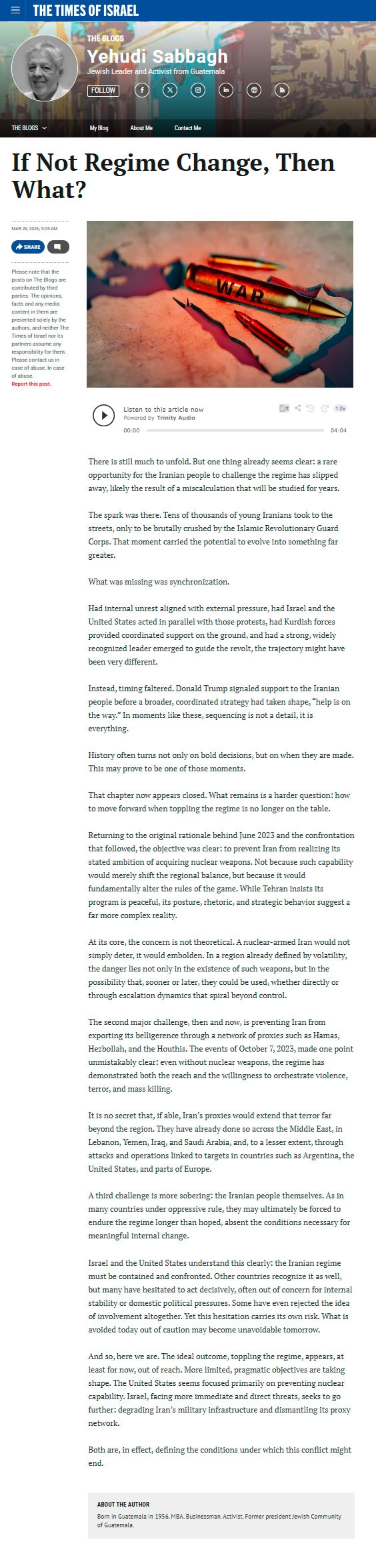 If Not Regime Change, Then What? (Times of Israel - 26 Mar 2026)